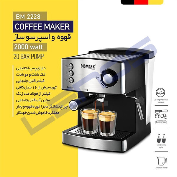 این محصول اسپرسوساز بیسمارک مدل BM2228 ساخت کشورآلمان و دارای توان قدرت 2000 وات و دارای میزان بار 20 میباشد. جنس بدنه این محصول از ترکیب استیل و پلاستیک مقاوم در برابر ضربه میباشد. مجهز به یک مخزن 1/6 لیتری هست دارای نشانگر میزان سطح آب می باشد. موارد استفاده این محصول دارای قابیلیت تهیه اسپرسو و کاپوچینو هست. این محصول دارای سیستم تنظیم میزان بخار هست. در قسمت جلو این محصول یک سینی تعبیه شده جهت جلوگیری از چکه شدن مواد بر روی دستگاه. ابعاد این محصول به طوری هست که به راحتی بر روی میز آشپزخانه یا در محل کار جاسازی میشود، بدون اشتغال کردن فضای اضافی محیط. دارای ظاهری زیبا و قابیلیت استفاده از پدر قهوه را دارد.